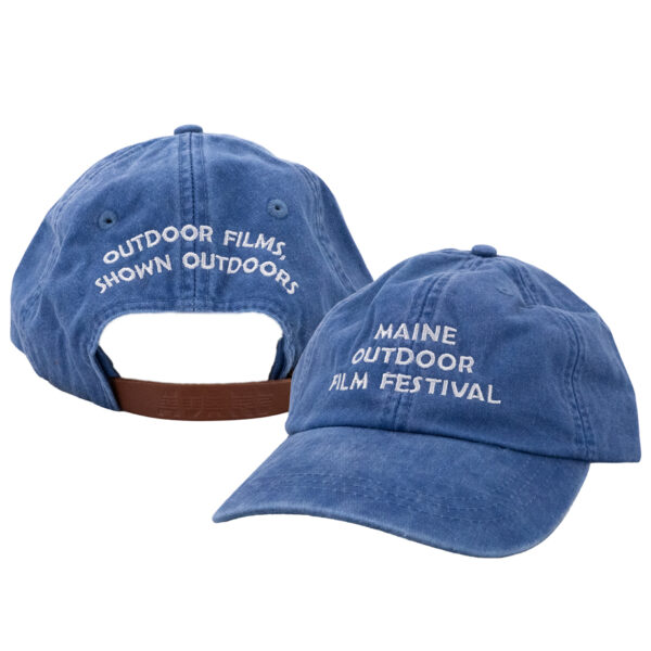 Blue Dad Hat Adams Optimum Pigment Dyed 100% Cotton 6 Panel Cap. Royal with white “Maine Outdoor Film Festival” on front, and white “Outdoor Films Shown Outdoors” on back. Leather strap, size adjustable.