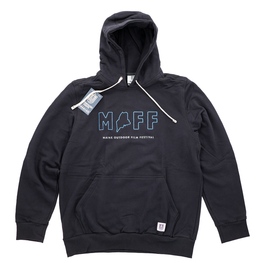 Unisex full-zip Black pullover hoodie with Light Blue “MOFF” centered on chest, with Maine as the “O” and Small White “Maine Outdoor Film Festival” underneath.