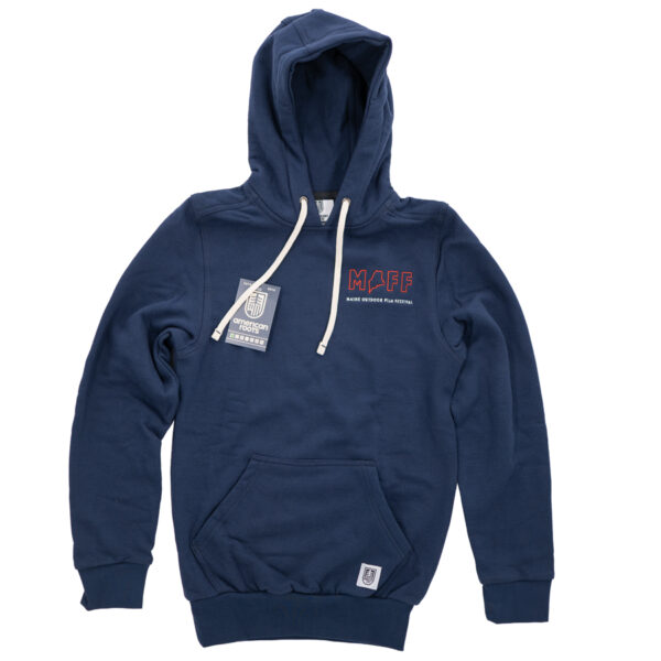 Unisex full-zip Navy pullover hoodie with Orange “MOFF” embroidered on left breast, with Maine as the “O” and